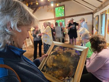 Jane Gilbert, also from Orland, paints color-saturated images of the Maine coastline so full of life you can practically feel the rocks in the landscape beneath your feet.